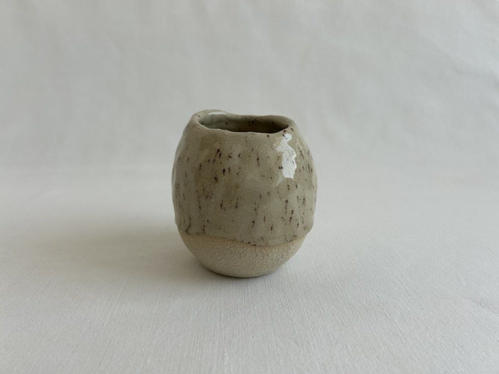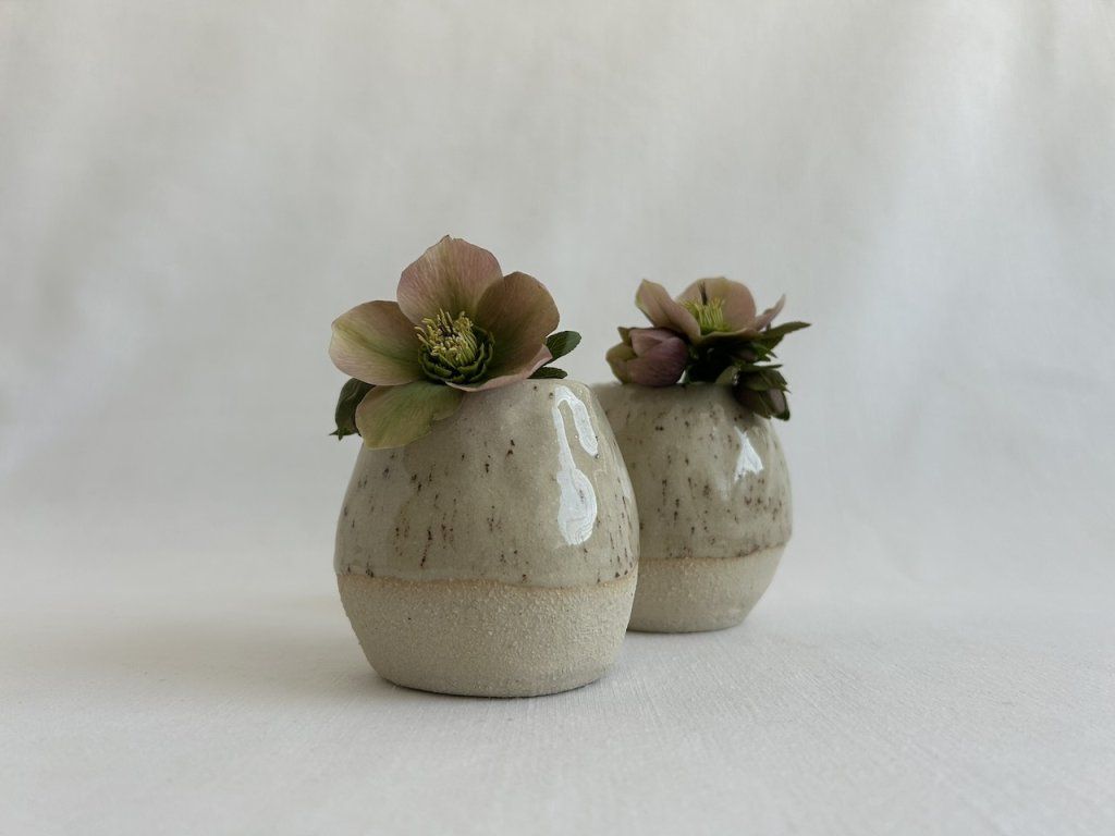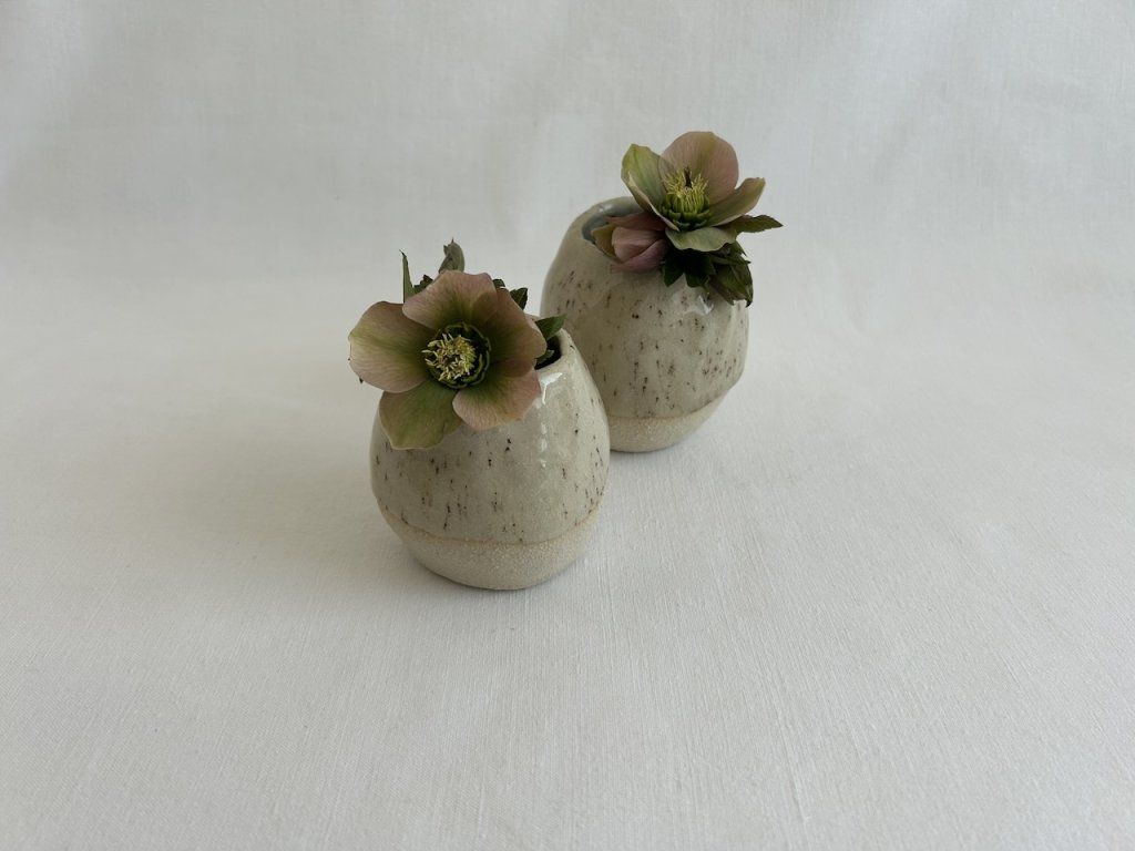 Ručně mačkané rustikální vázy ze světlé kameniny s kropenatou glazurou.